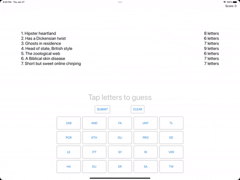 The user has to tapp in buttons containing portions of the answers to complete one of them