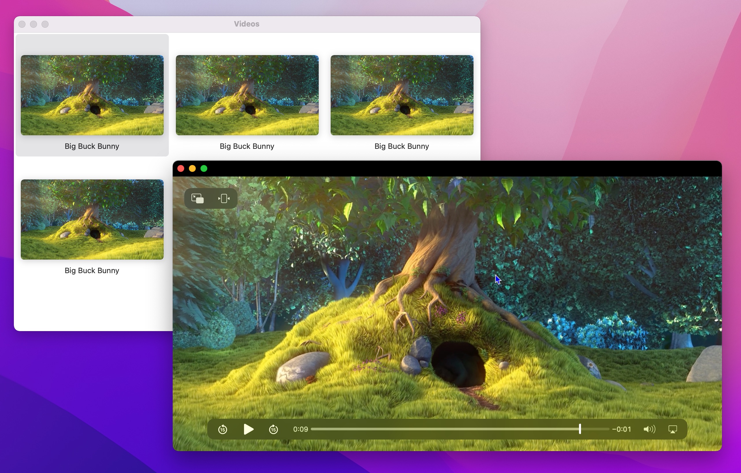 Simple Catalyst example (Mac idiom) of a grid-based app populated with videos. On macOS, double-clicking a video opens it in a new playback window. Keyboard navigation is fully supported via the UIKit Focus Engine.